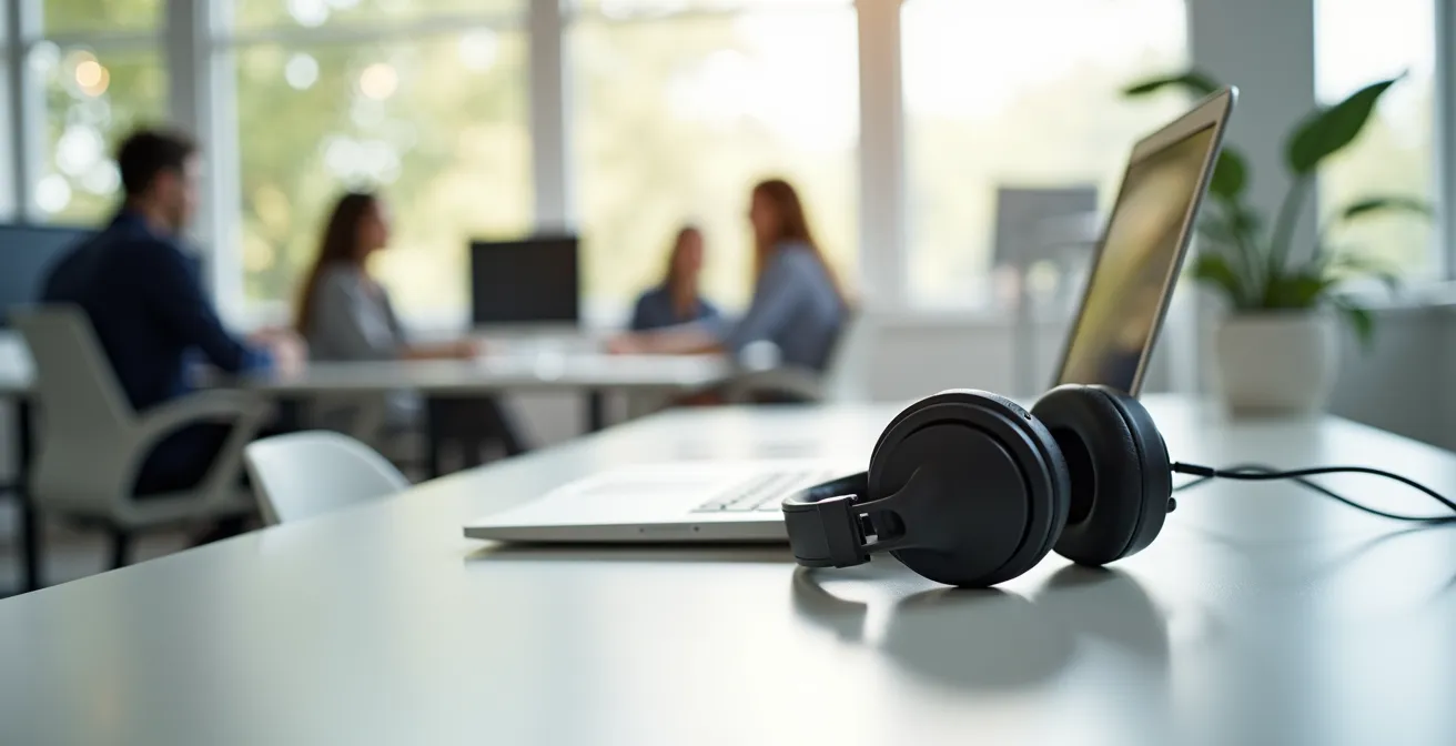 Face à ce constat, le casque à réduction de bruit change de statut. Il n’est plus un simple accessoire de confort, mais un outil stratégique de monotasking intentionnel. En le mettant, vous n’envoyez pas seulement un signal « Ne pas déranger » à vos collègues ; vous créez un contrat avec vous-même pour vous dédier à une seule tâche. Une étude a révélé que 73% des salariés se plaignent du bruit en open space. L’utilisation d’un casque pour créer une bulle de concentration permet de transformer cet espace partagé subi en un espace personnel choisi, avec des gains de productivité pouvant atteindre 61%, similaires à ceux observés en télétravail complet.
